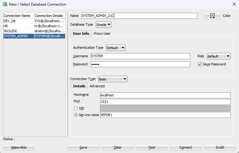 Název služby (Service Name): XEPDB1 (klíčové pro verzi XE).