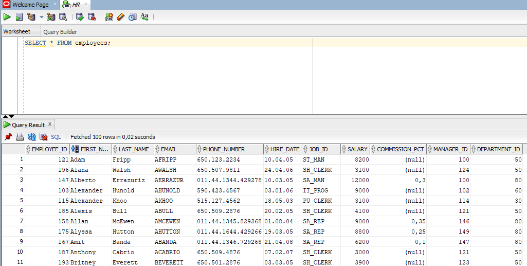 SELECT * FROM employees;Měli byste vidět seznam zaměstnanců (jako je Steven King, Neena Kochhar atd.). Pokud dotaz vrátí data, máte hotovo!